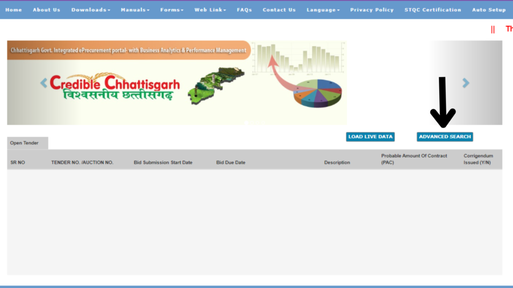 Now the Procurement Portal of Chhattisgarh is opened. Click on the Advananced search given at the top of the site.