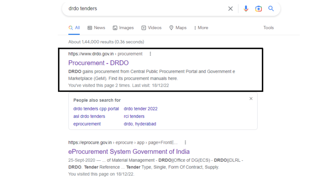 - First, go to chrome browser and Search DRDO Tenders/Procurement.