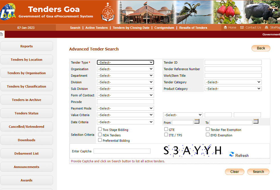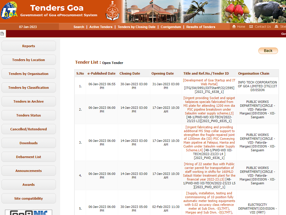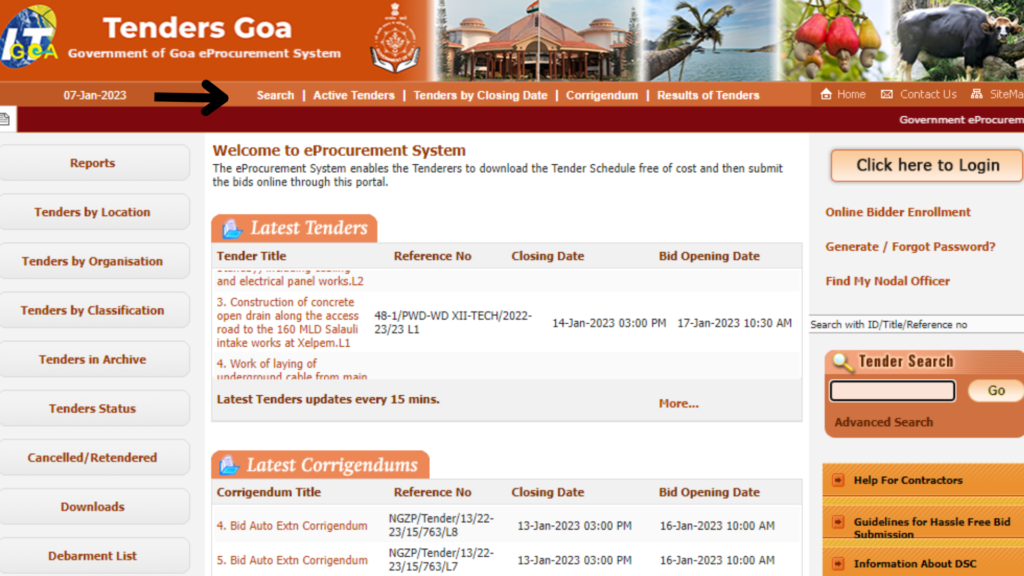 Now the Procurement Portal of Goa is opened. Click on the search option given at the top of the site.